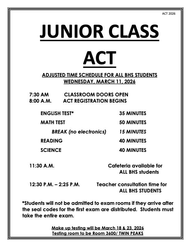 Brighton High School will be hosting the ACT for 11th grade Juniors on Wednesday, March 11th.  The day’s schedule has been adjusted to support the test.